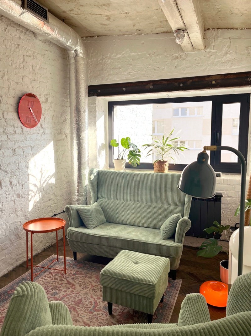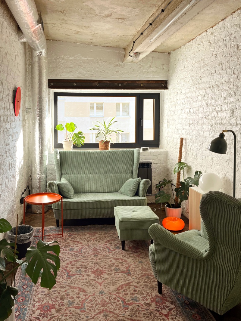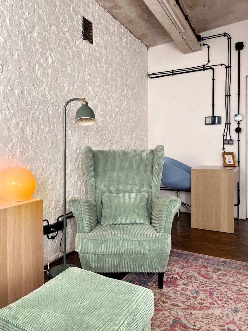 Przestrzeń sprawdzi się idealnie na konsultacje i sesje terapeutyczne, rozmowy 1:1, spotkania z klientami, pracę w skupieniu dla 1–2 osób oraz inne kameralne spotkania wymagające prywatności i spokoju.