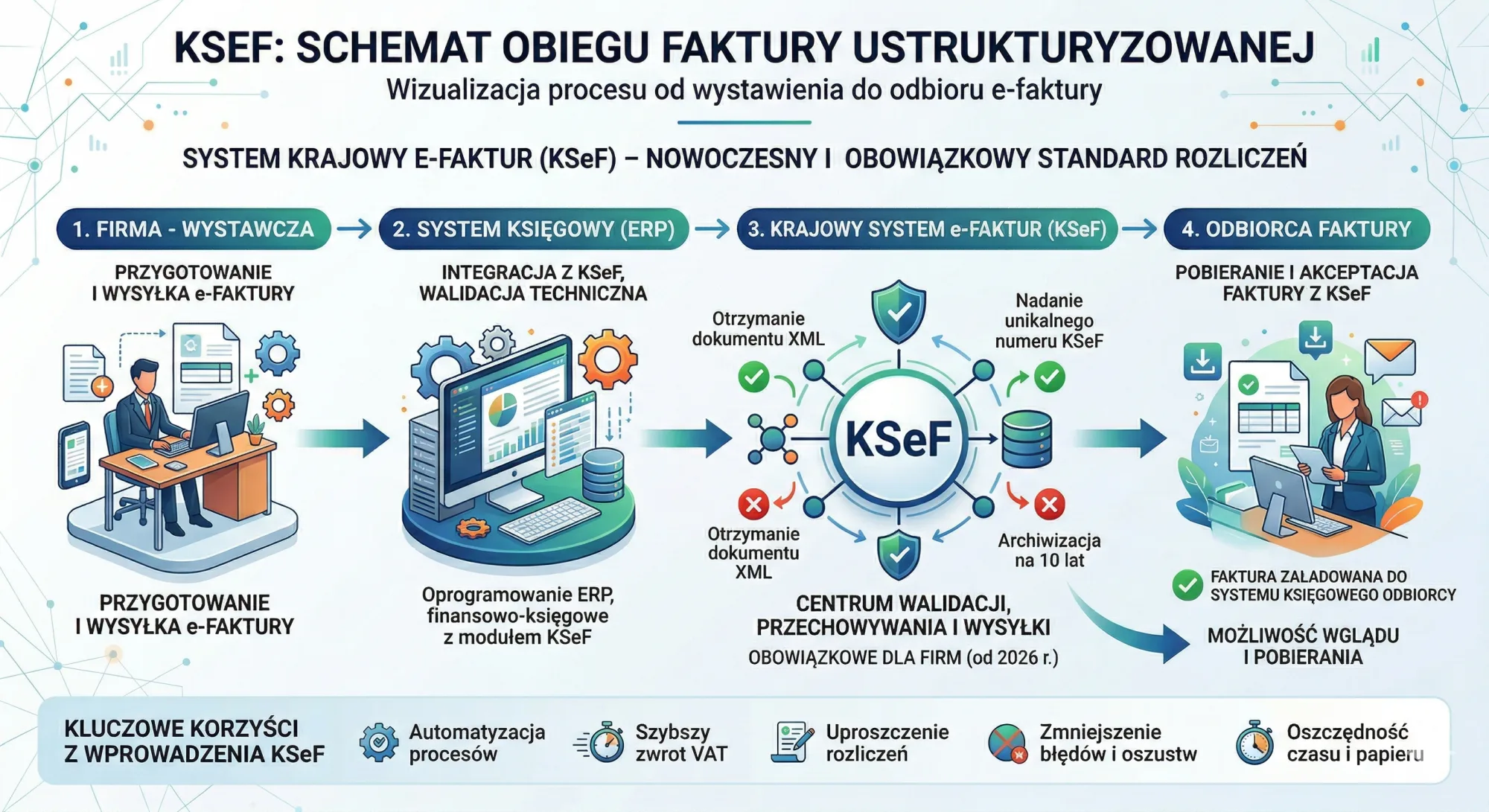 KSeF upraszcza ten proces. Faktura jest zapisana bezpośrednio w systemie, dzięki czemu: